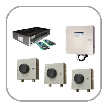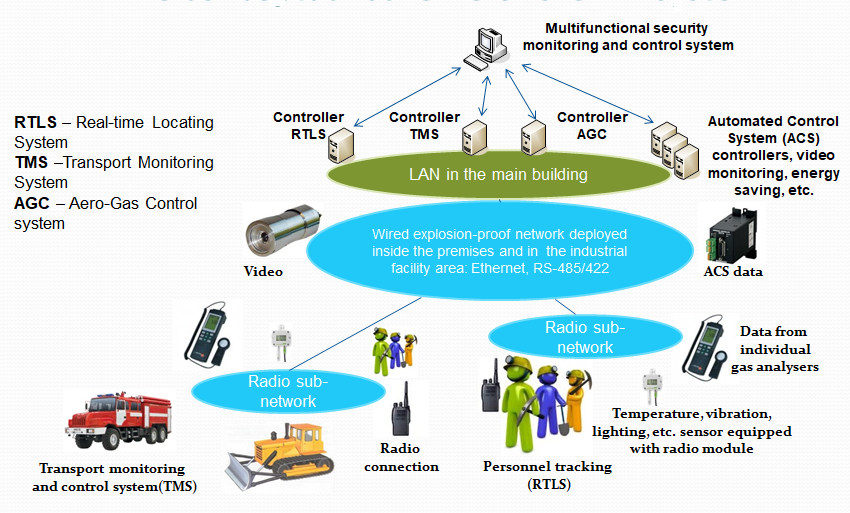 Various sensors (gas, temperature, dust, etc.) and controllers (relays, actuators, etc.) are connected into the system network